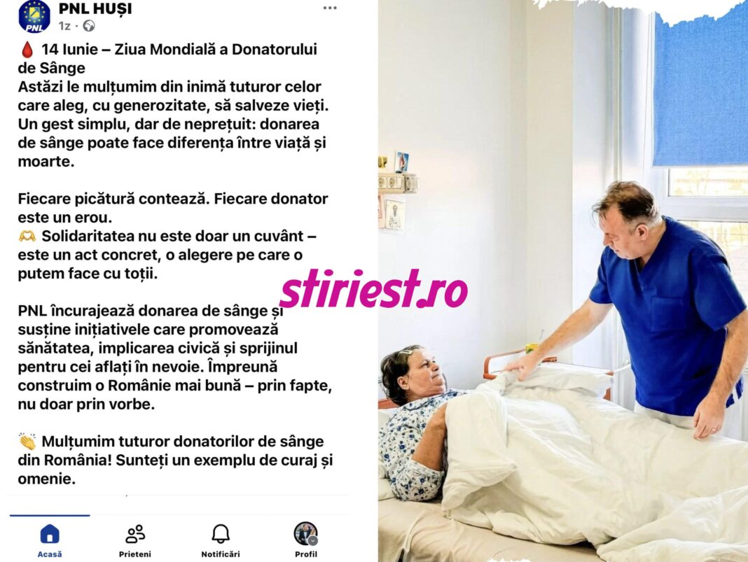 Organizația PNL Huși postează mesaje de „recunoștință” față de donatorii de sânge, cu ocazia Zilei Mondiale a Donatorului. Texte menite să inspire emoție și solidaritate. Doar că, în realitate, PNL Huși nu mai are nici rușinea necesară să-și coordoneze vorbele cu faptele. Pentru că în timp ce le mulțumesc „din inimă” celor care salvează vieți, tocmai au contribuit — activ sau prin tăcere — la desființarea condițiilor de a salva vieți în Spitalul Municipal din Huși.